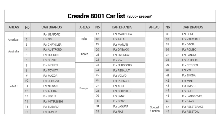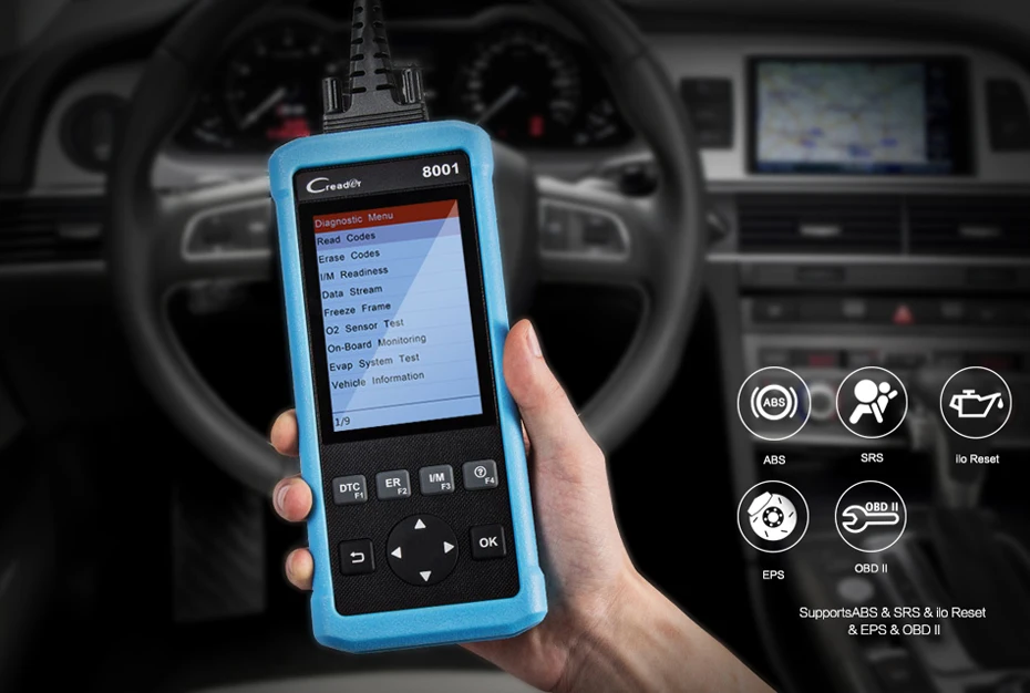 CReader 8001 is a small-size multipurpose CReader. It provides ten OBDII/EOBD diagnostic modes and also the following functions: oil reset, set service mileage, EPB reset. In addition, it supports ABS and SRS diagnosis to facilitate all-around car detection.