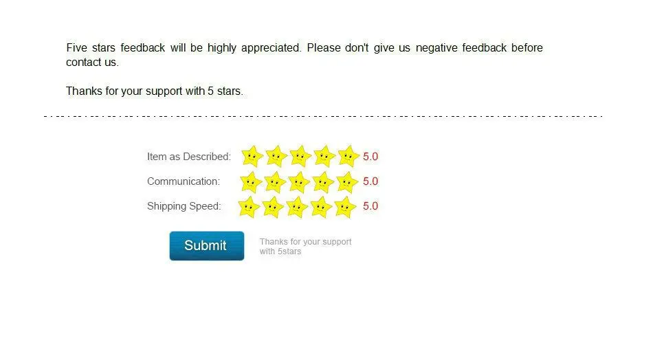 If the product you receive is not as described or low quality, the seller promises that you may return it before order completion (when you click "Confirm Order Received" or exceed confirmation timeframe) and receive a full refund. The return shipping fee will be paid by you. Or, you can choose to keep the product and agree the refund amount directly with the seller.N.B.: If the seller provides the "Longer Protection" service on this product, you may ask for refund up to 15 days after order completion.
