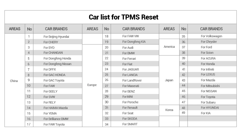 RESET FUNTION: Support Electrical Parking Brake(EPB) reset; Battery Management System(BMS) reset; Steering Angle Sensor(SAS) reset; Diesel Particulate Filter(DPF) reset; TPMS Reset; Works on 46 car models, see the description for more models.