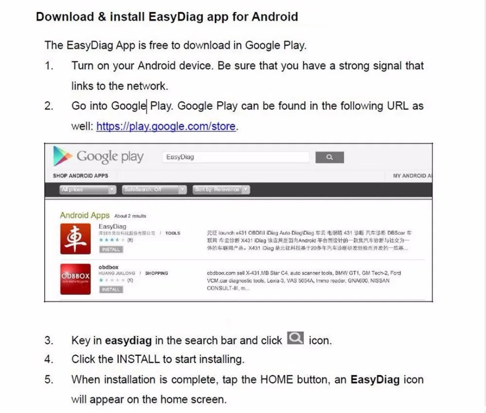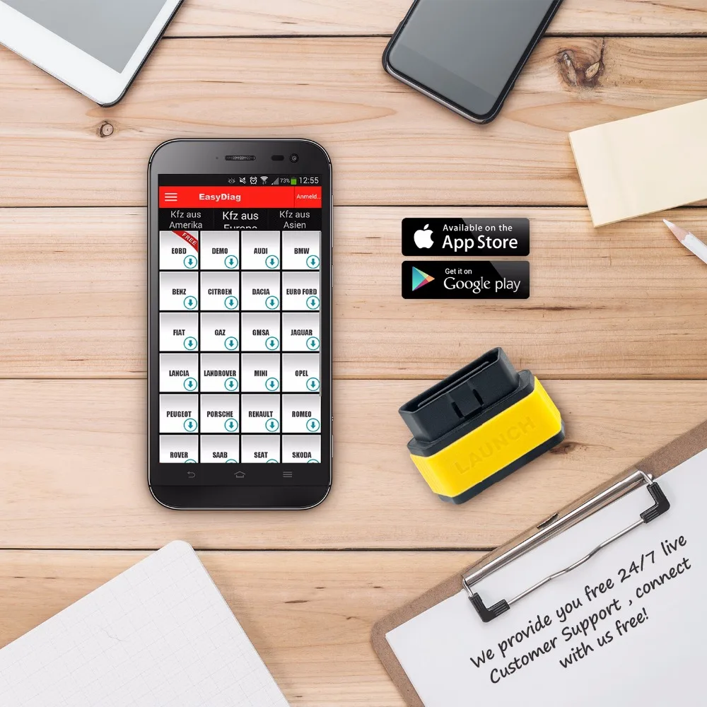 EasyDiag from Launch for android device into a powerful diagnostic scan tool, giving the technician full access to Engine, Transmission, ABS (Brakes), SRS (Seatbelts and Airbag) systems and more. A highly intuitive menu guides technicians through step-by-step procedures for viewing and clearing trouble codes, along with the ability to view enhanced live data. Full color graphing for OBD II is also available. This scan tool does not require an interface. A single Bluetooth connector along with the companys software allows the user to select from over 30 manufacturers for Asian, European and Domestic applications. Country of Origin:China Brand Name:Launch Product Features: International Approvals Launch EasyDiag Highlight: Vehicle diagnostic tool & Convenient, economical and advanced vehicle accessories 1.Supports OBD-II protocol, 10 test modes 2.Free OBD software download 3.Built-in Bluetooth module 4.Compatible with Andriod and iOS devices 5.Support all cars with 16-pin OBD port 6.Reads all DTCs and supports live data stream display ct Performance:Excellent and Stable