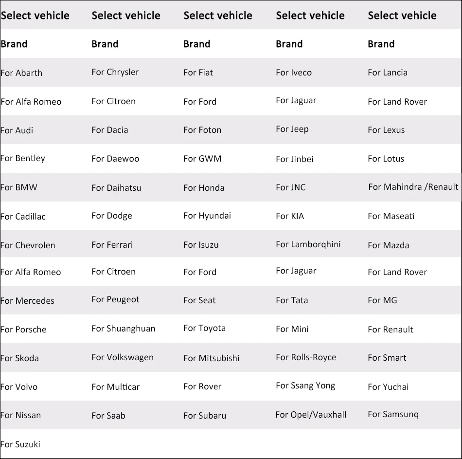 for AlfaRo.meo,for Au.di,for BM.VV,for Cadi.for llac,for Chevro.let,for Chr.ysler,for Citr.oen,for Da.cia,for Dae.woo,for Dod.ge,for Fer.rari,for Fiat,for Fo.rd,for Hon.da,for Hyun.dai,for Is.uzu,for Ive.co,for Jagu.ar,for Jeep,for Kia,for Lambor.for ghini,forLancia,for La.ndRo.ver,for Le.xus,for Lotus,for Mahundra/for Re.nault,for Maserati,for Maz.da,for Merc.edes,for M.G,for Mini,for Mitsu.bishi,for Ni.ssa.n,for Op.el/for Vauxhall,for Peug.eot,for Por-sch.e,for Ren.ault,for Rolls-royce,for Rov.er,for Sa.ab, for Sams.ung, forSeat, for Sko.da, for Sm-a.rt, forSs.ang Yong, for Sub-aru, for Suz.uki, for Toy.ota. for VW etc... ( And more car models will be released )
